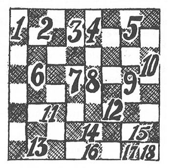 (Si consideramos a una serie de saltos sucesivos de un solo hombre como un único movimiento. la solución de Loyd requiere cinco movimientos. Sin embargo, puede hacerse en cuatro. La solución en cuatro movimientos puede hallarse en Amusements in Mathematics, de Henry Dudeney, problema 229. M. G.)