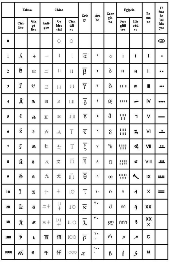 Por sí mismo es comprensible la imposibilidad de que los hombres hayan podido producir, en un momento dado, el tan conveniente método moderno de escritura de los números. Desde los tiempos antiguos, en los diversos pueblos con rudimentos de cultura, aparecieron diferentes notaciones numéricas poco parecidas, a nuestras notaciones modernas, no sólo por lo que al trazado de los signos se refiere, sino también en cuanto a los principios; por ejemplo, no en todas partes se empleaba el sistema decimal (entre los antiguos babilonios existía un sistema decimal y sexagesimal mixto). En la tabla adjunta se muestran, en calidad de ejemplo, algunas de las notaciones de los números en diversos pueblos. En particular, vemos que los antiguos griegos, y posteriormente también los rusos, utilizaron notaciones alfabéticas. Nuestras cifras "arábigas" modernas, y en general el método de escritura de las números, procede de la India, de donde fue llevado por los árabes a Europa en el siglo X, en donde finalmente arraigó en el, transcurso de varios siglos.