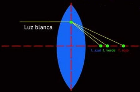 En la figura adjunta, una lente simple, no correctiva, descompone la luz en rojo, verde y azul. Si se usa el punto focal A, la imagen tendrá un halo azul y rojo en torno a cada punto.