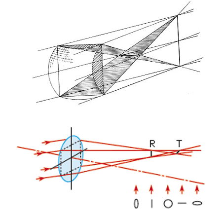 Este defecto de los lentes se debe a una curvatura irregular de la superficie del mismo. En este caso, las líneas horizontales aparecen enfocadas y las verticales desenfocadas, o viceversa.
