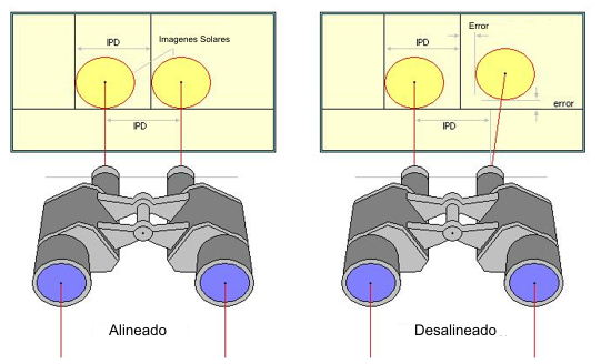 Posición de las imágenes del sol proyectadas por un binocular alineadalineado y la alineación de un binocular