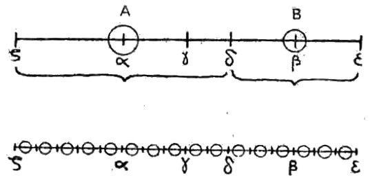 Tenemos que probar que g es el centro de gravedad de los dos pesos tomados en conjunto. Como A y B son conmensurables, también lo serán bg y ga. Supongamos que µs es la medida común de bg y ga. Hagamos ad igual a gb y as igual a gb.Entonces as = gb, puesto que bs = ga. Por tanto, sd está dividida en dos partes iguales en a como lo está de en b. Así pues, sd y de deben contener cada una a mu, un número par de veces.