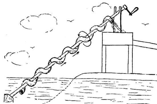 Figura 5. El tornillo de Arquímedes para elevar agua simplemente con hacerlo girar. Para comprender cómo trabaja, piénsese lo que ocurre en las partes bajas del tubo cuando gira y se verá que ascienden, no el tubo mismo, sino las posiciones del contenido "mínimo" de agua. Puede ayudar a la comprensión hacer una espiral con un alambre metálico y ver lo que ocurre cuando gira alrededor de su eje.
