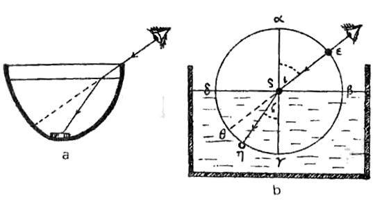 Explica el fenómeno de refracción por el sencillo experimento siguiente, mediante una moneda colocada en el fondo de una vasija llena de agua Ramada un "baptistir”[6] (Figura 6 a).