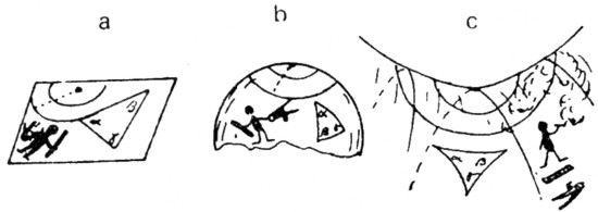 Figura 6. Experimentos de Ptolomeo sobre la refracción de la luz: a) La moneda en el fondo de una vasija llena de agua parece estar más alta que lo que está en realidad. b) El aparato para estudiar la refracción de la luz. Ptolomeo medía la relación entre el ángulo dzh en el agua y el ángulo aze en el aire y establecía la dependencia entre ellos.