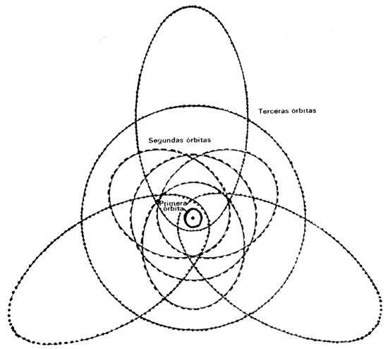Por el contrario, el mesón negativo retardado será cogido en una órbita cuántica y se convertirá en un miembro temporal del sistema atómico. Los cálculos realizados por Enrico Fermi y Edward Teller han demostrado que esta captura se verifica con suma rapidez, mucho antes de que el mesón retardado tenga posibilidad de desintegrarse. Como los radios de las órbitas cuánticas de Bohr son inversamente proporcionales a la masa de la partícula, la órbita del mesón será doscientas veces menor que la órbita del electrón más interior, y el mesón capturado se moverá muy próximo a la superficie del núcleo, pareciendo algo así como un satélite de la Tierra. Una vez en órbita, el mesón se encuentra ante dos posibilidades: puede desintegrarse en un electrón rápido negativo y dos neutrinos, y los contadores situados en torno al bloque registrarán la muerte de un mesón negativo. Pero al moverse tan cerca del núcleo puede ser engullido por éste. En efecto, si las fuerzas entre protones y neutrones son debidas al continuo canje de mesones entre ellos, debe producirse la reacción<