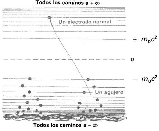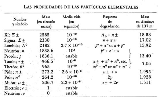 con una mitad de vida de sólo 10-16 segundos.Durante los años siguientes se fueron descubriendo y lloviendo sobre las cabezas de los físicos cada vez más partículas. Apareció un mesón K con la masa de 965 electrones y varias partículas más pesadas que los protones que recibieron el nombre de "hiperiones". Sus nombres, su forma de degradación y mitad de vida se consignan en la tabla adjunta y no hay garantías de que no se descubran más en el futuro próximo. Las fotografías de los sucesos elementales se están haciendo cada vez más intrincadas. Estas fotos se toman con un nuevo aparato llamado "cámara de burbujas" que es, en cierto modo, una inversión de la cámara de niebla. En lugar de gotitas líquidas formadas en un gas, se emplean en él las burbujas de gas formadas en un medio líquido como el hidrógeno líquido. Aunque nuestro conocimiento fáctico de las partículas elementales incremente rápidamente, chocamos contra un muro sólido cuando intentamos comprenderlas, y todas las teorías desarrolladas en esta dirección son hasta ahora de carácter puramente fenomenológico.
