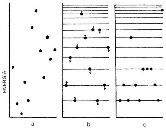 Consideremos un cristal hexagonal. Su punto cero absoluto se caracteriza por la congelación de todos sus grados de libertad excepto, claro está, el movimiento de los electrones en las órbitas de Bohr. Según Eddington, cada electrón posee 1/a = 137 grados de libertad. Además de los electrones, el cristal contiene también un número igual de protones. Para llegar al punto cero debemos atribuir a cada neutrón (es decir, un protón más un electrón) 2/a 1 grados de libertad, puesto que un grado de libertad queda congelado durante el movimiento del electrón en su órbita. Así pues, obtenemos para el punto cero de temperatura
