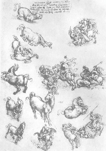 Este momento señala la iniciación de una nueva serie de estudios sobre caballos en movimiento que sumada a aquella que realizó para el monumento del Verrocchio, podemos ahora admirar en los manuscritos de Leonardo.