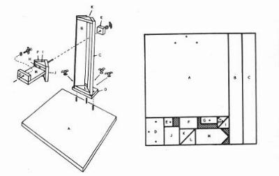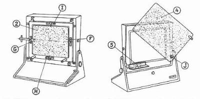 Figura 169. A: Tablero soporte normal. B: Tablero soporte giratorio. Instalación para títulos giratorios Muray; 2/4 tablero de títulos; 5, punta de acoplamiento; F/G, soporte horizontal; H/I, soporte vertical; J, soporte giratorio