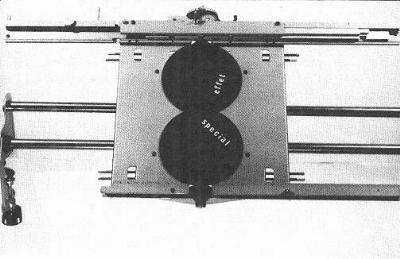 En el campo amateur, una versión más discreta de esta instalación puede rendir buenos servicios al combinar elementos de texto o fondo de dos o tres dimensiones y al tomar títulos tridimensionales para películas y series de diapositivas en estéreo. Tengo buenas experiencias con tres placas de cristal óptico, cuya distancia entre sí puede variarse con corcho de distinta longitud.