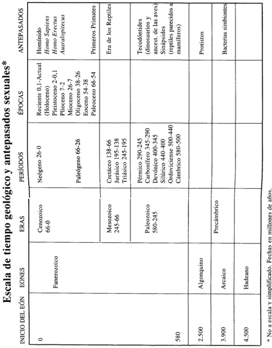 Empezamos a comprender la esencia sexual de los humanos adultos al escudriñar su lejana historia, difícilmente imaginable. Desde el nacimiento de Cristo han transcurrido menos de un millón de días; la presente obra, en cambio, habla de seres bacteriales que vivieron hace tres mil millones de años. Las actividades moleculares e intracelulares de aquellos seres todavía ejercen, como sucede con nuestros antecedentes más cercanos, una influencia fundamental sobre nuestra sexualidad. Y lo mismo sucede con las formas de nuestros parientes más cercanos. Demos un salto en el tiempo, hacia la época de aparición de los animales antropomorfos, hecho que, según las investigaciones con fósiles, ocurrió hace cuatro millones de años. Los huesos de australopitecinos, Australopithecus afarensis, hallados cerca de Hadar, en Etiopía, ponen de manifiesto que los machos de algunos de estos antepasados casi doblaban en tamaño a las hembras, lo que nos induce a pensar que, en nuestra evolución, es muy probable que el origen de la dominación del macho sobre la hembra date de tiempos muy remotos.