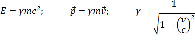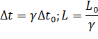 El tiempo en el que transcurre un evento o la longitud de un objeto dependen del sistema de referencia inercial en el cual se midan. Estos hechos son una consecuencia de los postulados de la teoría de la relatividad, y resulta fácil obtener las relaciones siguientes:donde Δt0 y L0 representan el tiempo y longitud medidos en el sistema de referencia en el que el evento u objeto se encuentran en reposo. Por el contrario, Δt y L se refieren a las medidas realizadas en un sistema de referencia en movimiento. El término γ se denomina «factor de Lorentz», y su expresión es: