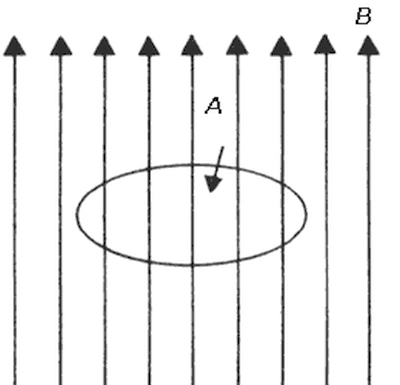 Después de muchos experimentos adicionales Faraday llegó a una conclusión muy importante. Para ello definió el concepto de flujo magnético a través de una superficie de la siguiente forma: supongamos que un circuito formado por un alambre conductor es un círculo. Sea A el área del círculo. Consideremos en primer lugar el caso en que la dirección del efecto magnético sea perpendicular al plano que forma el círculo (Figura 6) y sea B la intensidad del efecto. El flujo magnético a través de la superficie es el producto de B con el área del círculo, o sea, (BA). En segundo lugar consideremos el caso en que la dirección del efecto magnético no sea perpendicular al plano del círculo. Si proyectamos la superficie del círculo perpendicularmente a la dirección del efecto, se obtiene la superficie A'. El flujo magnético es ahora igual a (BA'). Llamaremos al área A' el área efectiva. El flujo es, por tanto, igual a la magnitud del efecto magnético multiplicada por el área efectiva.