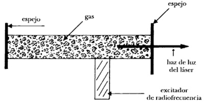 En la figura 57 se muestra un esquema de un láser. El tubo contiene la sustancia que va a producir la emisión estimulada de luz. Esta se escoge de manera que sus niveles de energía proporcionen radiación en la frecuencia de interés. Por ejemplo, se usan gases como la mezcla de helio-neón, de bióxido de carbono, etc. El bombeo, o sea la inversión de la población, se logra por medio de una descarga de radiofrecuencia, proporcionada por el excitador externo.