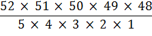 posibles maneras de tener cinco cartas. Como en el juego no importa el orden, dividiremos el producto por (5 × 4 × 3 × 2 × 1) y obtenemos que hay 2.598.960 manos posibles. Conociendo este número podemos calcular varias probabilidades interesantes. La de tener cuatro ases, por ejemplo, es 48/2.598.960 (aproximadamente 1 entre 50.000) pues hay 48 manos distintas con cuatro ases, debido a que la quinta carta puede ser cualquiera de las 48 restantes en el mazo.Obsérvese que los números obtenidos en los tres ejemplos tienen la misma forma: