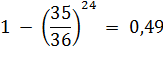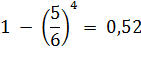Como la probabilidad de que no salga ningún 6 en una tirada del dado es 5/6, la probabilidad de que no salga en ninguna de las cuatro tiradas es (5/6)4. Restando este número de 1 tendremos la probabilidad de que este caso (ningún 6) no ocurra, es decir, de que salga por lo menos un 6: