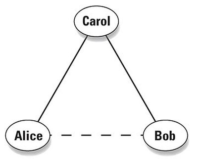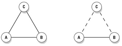 Más desequilibrado está un triángulo con una única relación negativa. Por ejemplo, supongamos que Carol se lleva bien tanto con Alice como con Bob, pero Bob y Alice se odian. Quizá en su día fueron pareja, pero sufrieron una desagradable ruptura y cada uno critica al otro ante la siempre leal Carol. Esto provoca estrés psicológico en todos los frentes. Para recuperar el equilibrio, o bien Alice y Bob se reconcilian, o Carol tendrá que decidirse por una de las partes.