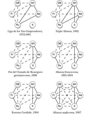 Los estudiosos han empleado estas ideas para analizar el periodo previo a la Primera Guerra Mundial[10]. El diagrama siguiente muestra las alianzas cambiantes entre Gran Bretaña, Francia, Rusia, Italia, Alemania y Austria-Hungría entre 1872 y 1907.