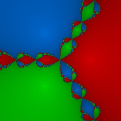 Este punto se convierte entonces en la siguiente z. Este proceso se repite hasta que z se acerca lo suficiente a una raíz o, de manera equivalente, hasta que z3 − 1 se acerca lo suficiente a cero, donde «se acerca lo suficiente» denota una distancia muy corta, elegida arbitrariamente por la persona que programó el ordenador. A todos los puntos iniciales que llevan a una raíz concreta se les asigna el mismo color. Por lo tanto, el rojo marca todos los puntos que convergen a una raíz, el verde marca otra y el azul otra tercera.Las instantáneas de las fractales resultantes de Newton fueron amablemente proporcionadas por Simon Tatham. Para más información sobre su obra, véase «Fractals derived from Newton-Raphson iteration», en su página web http://www.chiark.greenend.org.uk/~sgtatham/newton/.