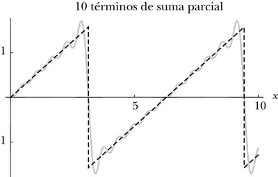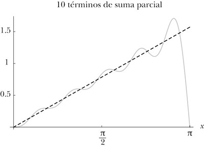 Por ejemplo, considere la onda de diente de sierra descrita en este capítulo. Cuando x se acerca al borde de un diente de sierra, se necesitan más y más términos de la serie de Fourier para alcanzar un determinado nivel de aproximación. Eso es lo que queremos decir cuando afirmamos que la convergencia no es uniforme. Se produce a diferentes velocidades para diferentes x.
