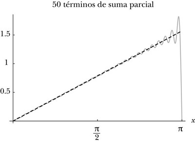 En este caso, la no uniformidad de la convergencia se puede atribuir a las patologías de la serie armónica alterna, cuyos términos aparecen como coeficientes de Fourier de la onda de diente de sierra. Como se expuso anteriormente, la serie armónica alterna converge, pero solo por la cancelación masiva provocada por su mezcla alterna de términos positivos y negativos. Si todos sus términos se hicieran positivos tomando su valor absoluto, la serie se desviaría (la suma se acercaría a infinito). Por eso se dice que la serie armónica alterna converge de manera condicional, no absoluta. Esta forma precaria de convergencia luego infecta la serie de Fourier correspondiente y lo hace de manera no uniforme convergente, lo que conduce al fenómeno de Gibbs y su dedo burlón alzado cerca del borde.