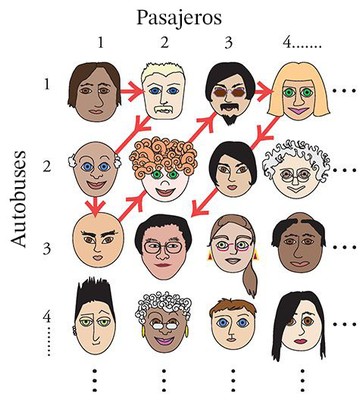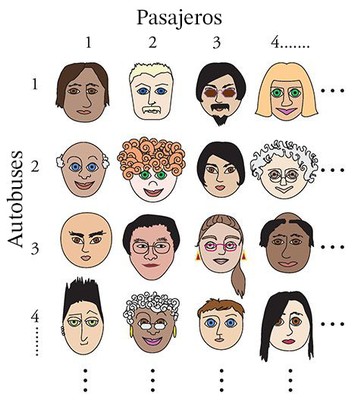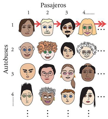 Por supuesto, no podemos mostrar, literalmente, a todos aquí, ya que el esquema tendría que ser infinito en ambas direcciones, pero una versión limitada de la imagen es suficiente. Lo importante es que cualquier pasajero concreto de un autobús (su tía Inés, por ejemplo, que ha venido de vacaciones desde Louisville) aparece seguro en alguna parte del diagrama, siempre y cuando se incluyan suficientes filas y columnas. En ese sentido, todas las personas de cada autobús se contabilizan. Puede nombrar al pasajero y es seguro que estará representado a un número finito de pasos al este y al sur de la esquina del diagrama.