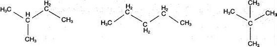 Caí en un sueño, y he aquí que los átomos estaban retozando ante mis ojos. Cada vez que, hasta entonces, estos seres diminutos se me aparecían, estaban siempre en movimiento. Ahora, sin embargo, veía cómo con frecuencia dos átomos más pequeños se unían para formar un par; cómo uno más grande abrazaba a los dos más pequeños; cómo otros, aún mayores, sujetaban a tres o incluso cuatro de los más pequeños, mientras que el conjunto seguía girando en una danza vertiginosa. Veía cómo los más grandes formaban una cadena arrastrando tras ellos a los más pequeños, pero sólo en los extremos de la cadena.Kekulé, despertado por el grito de «¡Clapham Road!» del conductor, volvió a su habitación y pasó el resto de la noche esbozando las fórmulas en las que iba a basarse su teoría de la estructura. Se sabía que el carbono tiene una valencia cuatro; en otras palabras, cada átomo de carbono puede unirse a otros cuatro átomos para formar un compuesto. En el ejemplo sencillo dado aquí, la molécula C5H12, pentano, existe en tres formas, donde CH3 y CH2 representan átomos de carbono unidos a tres y a dos átomos de hidrógeno: