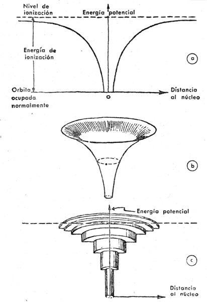 Figura 2. En estos tres esquemas está representado el `pozo de potencial” ocupado por los electrones que giran en órbitas. La curva a) muestra que, cuanto más alejada del núcleo está la órbita electrónica, mayor es la energía potencial. En b) se indica la forma en que la curva, que se extiende en todas direcciones alrededor del núcleo del átomo, origina un `pozo” dentro del cual queda atrapado el electrón hasta que la energía transmitida desde una fuente externa, empuja al electrón y éste escapa de su átomo padre. En c) se observa que el electrón puede, en realidad, ocupar sólo ciertos niveles de energía. Estos estados cuantificados representan las órbitas permitidas entre las cuales salta el electrón a medida que absorbe o emite energía.