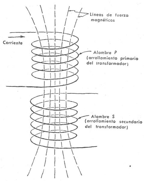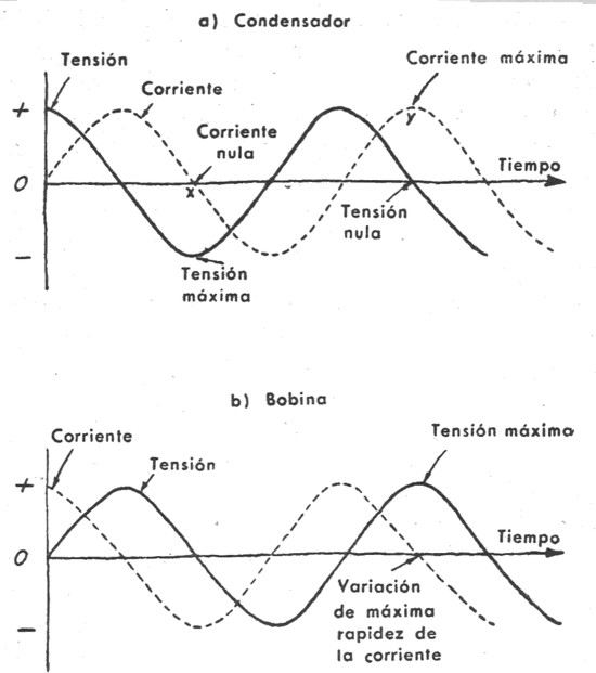 También se puede considerar todo esto de otro modo. Vimos en el capítulo 3 que la corriente de una bobina de alambre origina líneas de fuerza magnéticas que unen las vueltas de la bobina y que un campo magnético variable induce una corriente en aquélla. Cuando hacemos pasar una corriente alterna por la bobina, las variaciones en la corriente crean un campo magnético variable y éste, a su vez, induce una corriente que se opone a la corriente original. Comprobamos, entonces, que una bobina, aun cuando tenga una resistencia eléctrica despreciable, se opondrá al flujo de una corriente alterna. Esta oposición se denomina reactancia inductiva.