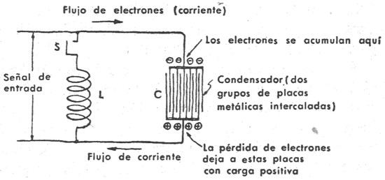 Los medios ciclos de corriente pasan a través de la válvula a una resistencia, sobre la cual desarrollan medios ciclos de tensión. Conectado en paralelo a la resistencia hay un capacitor y los medios ciclos de tensión cargan el capacitor. Cuando dichos medios ciclos aumentan su amplitud (como en A, figura 36 c), aumenta también la tensión en el capacitor; cuando disminuyen de tamaño (en B), la tensión en el capacitor se hace más pequeña. Por lo tanto, el capacitor desarrolla sobre sí mismo una tensión, que solamente sigue a las variaciones de amplitud de las alternaciones de alta frecuencia, pero que no responde a las alternaciones individuales. El tamaño del capacitor debe ser tal, que resulte lo bastante grande como para que no pueda seguir las alternaciones muy rápidas de la corriente de la onda de radio, pero lo bastante pequeño como para seguir las variaciones mucho más lentas en la forma de onda de video. En realidad, el capacitor toma el promedio de los medios ciclos de alta frecuencia y este promedio es, precisamente, lo que buscamos, la forma de onda de video original.