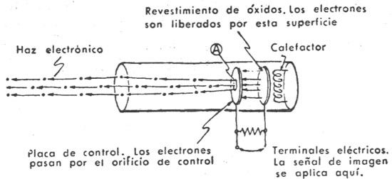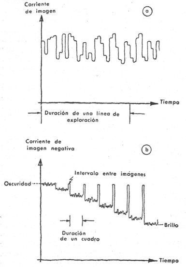 La célula fotoeléctrica es la aplicación práctica de este principio, pero en la cámara de televisión se lo emplea en forma más sutil. En el capítulo 4 veremos con más amplitud cómo actúa; por ahora el principio nos resulta claro. Si se enfoca la imagen visual sobre una superficie fotoeléctrica, se libera electrones en número directamente proporcional al brillo de cada punto particular de la imagen. Esto registra en términos electrónicos la luz y sombra de la imagen visual que deseamos televisar.