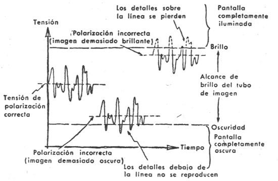 Cuando el haz electrónico está controlado, en cuanto a la dirección, por corrientes de desviación correctamente reguladas y, en cuanto a la corriente, por la señal de imagen, el tubo de imagen produce sobre su pantalla el modelo de imagen deseado de luz y sombra. Si la sincronización es la correcta y la señal de imagen ha estado bien protegida de la distorsión y el ruido, la imagen será una copia aceptable de la escena enfocada en el tubo de cámara. Pero si no se cumplen dichas condiciones, la imagen puede estar tan atenuada, que poco disfrutaremos con ella. Por ejemplo, si la sincronización vertical no es buena, la imagen parecerá “rodar” hacia arriba o hacia abajo. Para evitarlo, se ajustan los circuitos de desviación vertical mediante una perilla, el control de sincronismo vertical. Si la desviación horizontal no está bien sincronizada, la imagen se divide en barras dentadas paralelas; esto se controla por medio del botón de sincronismo horizontal. Por último, la tensión total de la señal de imagen aplicada al tubo de imagen puede ser demasiado grande o demasiado pequeña. Si es demasiado grande, las zonas iluminadas de la imagen serán demasiado brillantes y los grises oscuros parecerán negros. Si la tensión es demasiado pequeña, todos los tonos de la imagen `son grises y la imagen parece “lavada”. Para corregirlo, existe un “control de contraste”. Este dispositivo varía la amplificación de la señal de imagen y permite al espectador regular los matices entre el negro y el blanco. Dichas funciones de los circuitos y los controles son comunes a todos los tubos de imagen, cualquiera que sea el lugar en que se los use: en un monitor en el estudio de televisión, en la unidad reproductora de un sistema de TV de circuito cerrado o en un receptor hogareño.