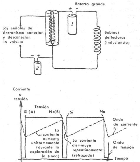 En el extremo receptor del cable, la señal de, imagen se divide en dos partes que transportan, respectivamente, la información de imagen y la de sincronismo. Observamos en la lámina III a que estos dos tipos de información se producen a cada lado del nivel de borrado de la onda, la información de sincronismo abajo y la información de imagen arriba. Si se hace pasar la señal por una forma especial de amplificador (amplificador separador de sincronismo), que responde solamente a las partes de la señal que están por debajo del nivel de borrado, separamos la información de sincronismo de la de imagen. Los impulsos de sincronismo separados se usan, entonces, para el control de los generadores de desviación, los cuales pasan las corrientes de desviación por bobinas colocadas en el cuello del tubo de imagen. En esta forma, la posición del haz electrónico se tiene que desplazar por la pantalla en fase con el haz de la cámara.