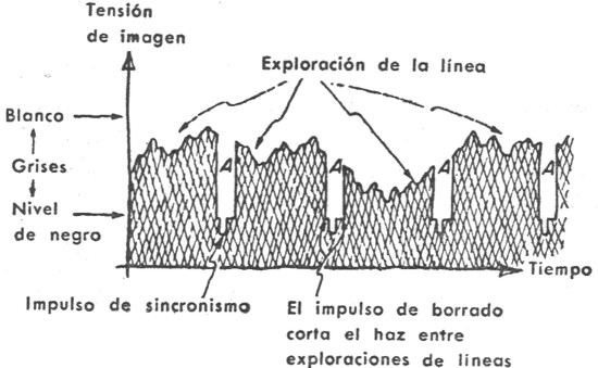 Si examinamos gráficamente (lámina III) la onda de la señal de imagen que la cámara genera, podremos hacer que estas generalidades resulten más específicas. Hemos elegido aquí una línea característica de una imagen típica y trasladado sus valores de la luz a los valores correspondientes de la corriente, representados en función del tiempo. También hemos representado los impulsos de borrado y de sincronismo. Este gráfico se denomina “forma de onda de video”. En él incluimos las partes esenciales de la imagen que se va a reproducir en nuestro hogar; la tarea del sistema de televisión consiste en entregar al tubo de imagen, con la mayor fidelidad posible, una corriente eléctrica que tenga esa forma de onda.