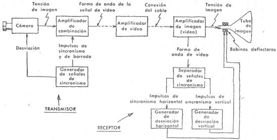 La figura 32 representa sus componentes esenciales. La cámara y el generador de sincronismo, vistos en el capítulo precedente, producen la señal de imagen, incluyendo (figura 31) los impulsos de borrado y de sincronismo. La señal de imagen se desplaza a lo largo de un cable hasta el receptor. Durante su viaje, el movimiento ordenado de los electrones de la corriente de la señal se debilita gradualmente a medida que los electrones chocan con los iones del metal de los alambres que constituyen el cable. Si éste mide más de 1.500 a 3.000 metros, tiene que haber amplificadores que compensen el proceso de debilitamiento y mantengan la intensidad de la señal por encima del nivel de ruido. En estas condiciones, la señal llegará al extremo del cable en un estado razonable de conservación, no contaminada por ruidos notables y, esperemos, libre de manchas y de overshoot.