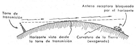 Figura 33. La curvatura de la Tierra en el horizonte constituye el obstáculo fundamental para las ondas de televisión. La antena transmisora y la receptora tienen que estar ubicadas lo más alto posible a fin de permitir la recepción a larga distancia.
