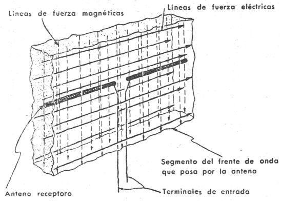 Figura 34. Las líneas de fuerza magnéticas y eléctricas en el frente de onda radial inducen la corriente de la señal en la antena receptora. Puede considerarse que la onda se aproxima desde el ángulo derecho inferior.