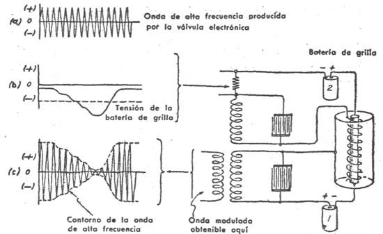 Recordemos que el oscilador funciona tomando una parte pequeña de su potencia de salida y realimentando con ella su potencia de entrada. La válvula amplifica esta etapa de realimentación y la porción aumentada aparece otra vez en el circuito de salida. El oscilador, diríamos así, “persigue su cola” y la amplitud de las oscilaciones depende de la amplificación que da la válvula. Si se hace variar la amplificación, se varía el tamaño de las oscilaciones. Se puede cambiar la amplitud, variando la tensión de grulla. Luego, si sumamos la tensión de onda de video a la de la batería de grilla (figura 35 b), hacemos que la función amplificadora de la válvula aumente y disminuya, con los consiguientes repliegues de la onda de video. Entonces, las oscilaciones de la salida se asemejan a las de la figura 35 c, y se comprueba que la corriente de la onda de radio transporta la forma de onda de video. El resultado se denomina “modulación de amplitud” (literalmente, modificación de amplitud).