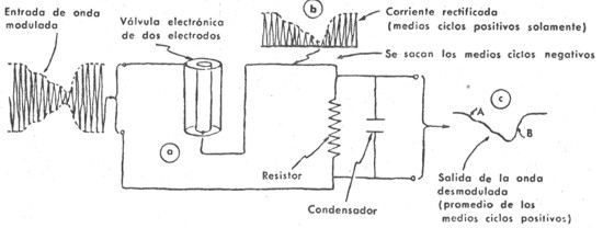 Figura 36. La desmodulación es el proceso de separación de la corriente de imagen y la onda de radio en el receptor. La válvula electrónica, a), de dos electrodos, lleva corriente en un sentido solamente, y saca así la mitad de cada alternación de alta frecuencia, como se ve en b). Los valores de la resistencia y de la capacidad conectadas a la válvula son demasiado grandes para seguir las variaciones de la alta frecuencia. Toman el valor medio de los medios ciclos sucesivos, recuperando así la tensión de imagen, como en c).