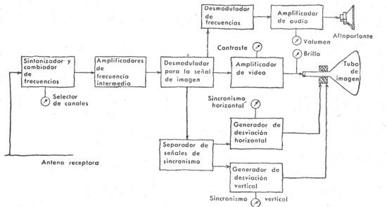 El capítulo concluirá con un examen más detallado de las funciones de un receptor de televisión. El esquema de la figura 37 representa las secciones principales. La primera sección es la de sintonización, controlada por la perilla selectora de canales y el control de sintonía fina. La corriente proveniente de la antena pasa primero a un amplificador con válvula electrónica, una parte del sintonizador, conocido como amplificador de radiofrecuencia. Asociado con su circuito de entrada hay cierto número de bobinas, una de las cuales se pone en posición para cada canal. La inductancia de cada bobina resuena con su propia autocapacitancia a la frecuencia del canal para el que está diseñada. Para el canal de frecuencia más baja, Canal 2 (54 a 60 megaciclos[1] se requiere una bobina relativamente grande y para el Canal 13 (210 a 216 megaciclos) es necesaria una mucho más pequeña. El control de sintonía fina regula un pequeño capacitor variable auxiliar, de modo que la frecuencia de resonancia de la combinación bobina y capacitor está centrada con toda precisión en la frecuencia del canal que se desea.