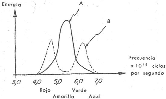 Figura 38. La luz de color se describe en términos físicos mediante una curva de distribución de energías. La curva típica A representa el color amarillo, que tiene una componente intensa en la región del amarillo del espectro. La distribución indicada en B tiene componentes en la región del rojo y del verde y es físicamente diferente de la indicada en A, pero para el ojo es el mismo amarillo.
