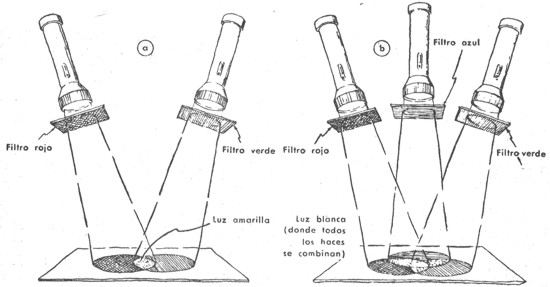 Figura 39. Cuando se mezclan luz roja y luz verde superponiendo, por ejemplo, los haces de linternas provistas de filtros, a), se origina luz amarilla. Los tres colores primarios (rojo, verde y azul) producen luz blanca, b), cuando se los mezcla en la proporción adecuada. Si se altera la intensidad de los tres colores primarios y se los suma o se los sustrae, es posible reproducir cualquier color visible.