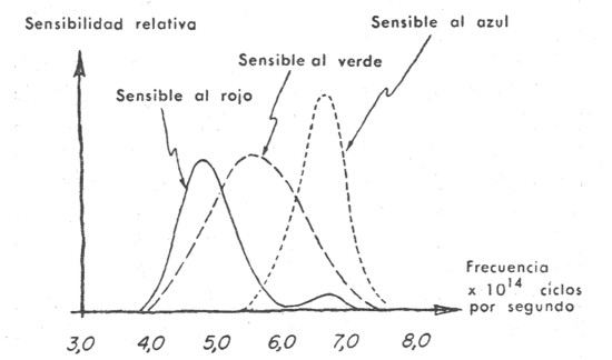 Figura 40. Aunque no sabemos con precisión cómo ve el ojo los colores, los expertos suponen que la retina puede tener tres clases distintas de receptores del color, con curvas de sensibilidad posiblemente semejantes a las aquí dibujadas. Esto explicaría el hecho de que, cuando se mezclan tres colores primarios, se puede reproducir la gama total de colores del espectro visible.