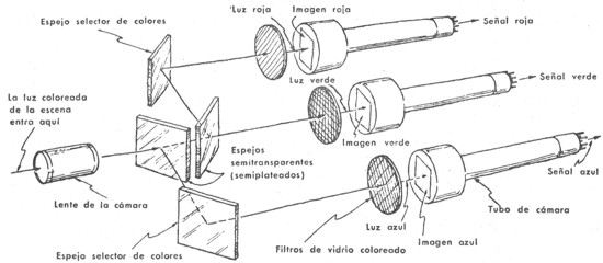 Figura 41. Cómo funciona la cámara de televisión en colores. Mediante espejos y filtros selectores de colores se enfoca la escena del estudio, en tres tubos de cámara, en los tres colores primarios.