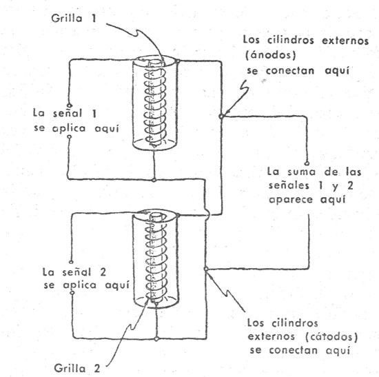 Figura 42. Dos válvulas electrónicas pueden sumar dos señales con las que alimentan sus grillas respectivas al conectar sus ánodos. La sustracción se produce si invertimos las conexiones de uno de los circuitos de entrada. Tres válvulas con sus ánodos conectados combinan las señales de los tres colores primarios producidos por la cámara para colores.
