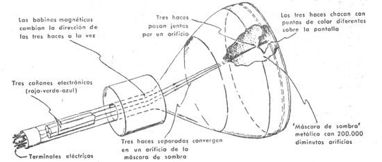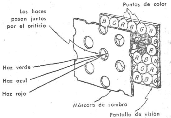 Por último, todavía nos queda el problema de lograr que el haz de cada uno de los tres cañones electrónicos incida solamente sobre los puntos apropiados en la pantalla del receptor. Se resuelve por medio de una placa metálica con más de 200.000 diminutos orificios, colocada entre los cañones y la pantalla.