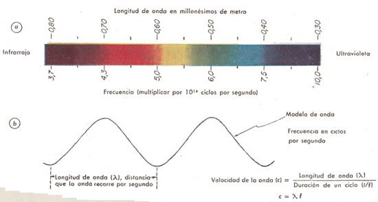 Normalmente, se dice que la luz roja difiere de la azul en que tienen diferente longitud de onda, pero una distinción más satisfactoria es la de la frecuencia (ver lámina II y figura 1a para la explicación de estos términos). Esto se debe a que la longitud de onda (la distancia entre dos máximos o entre dos mínimos) de cualquier luz de color no es siempre la misma. Por ejemplo, si la velocidad de la luz (c) varía, como sucede en realidad, cuando la luz pasa de un medio transparente a otro, por la relación entre la longitud de onda (&lamda;) y la frecuencia se verá que el producto (c= &lamda;f ) debe variar. Cuando esto sucede, la frecuencia no varía, la longitud de onda sí. Las ondas luminosas tienen una frecuencia de unos 1014 ciclos por segundo. Este es un número casi inconcebiblemente grande; 1014 es igual a cien billones. Las longitudes de onda correspondientes son casi inconcebiblemente pequeñas, alrededor de la mitad de un millonésimo de metro.