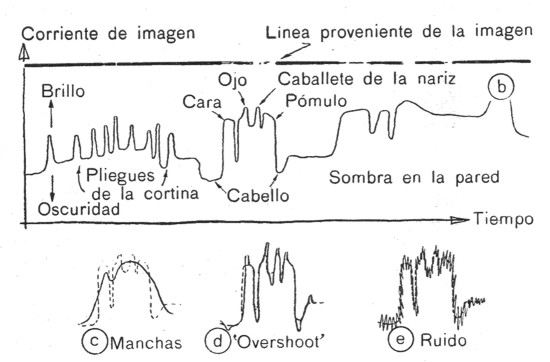 La lámina III muestra algunos de los reveses que pueden sufrir las formas de onda de video durante su viaje. El primero (lámina III b) es una forma de distorsión conocida como imagen manchada, que afecta las pendientes más pronunciadas de la onda; antes de que la onda haya alcanzado el tubo de imagen, esa inclinación desaparece. Ahora bien, esa empinada pendiente puede representar un límite agudo entre una encantadora morocha vestida de negro y su fondo más claro. Con la distorsión, el límite reproducido es relativamente indistinto, la imagen aparece borroneada. Las manchas aparecen siempre que los amplificadores (o cualquier otra parte del sistema de transmisión) no funcionan lo bastante rápido como para seguir las pendientes empinadas que genera la cámara. Otra forma de distorsión, conocida como overshoot, aparece cuando los amplificadores no funcionan con la rapidez necesaria. Entonces, en su ansiedad por seguir dicha pendiente, el amplificador puede persistir aún después de terminada la pendiente original: se recupera un poco tarde. Estas variaciones en la forma de la onda (lámina III b) crean límites demasiado definidos en la imagen reproducida: contornos que no existen en la imagen original. El lector podrá, probablemente, producir deformaciones, tales como imágenes manchadas y overshoot en su aparato de televisión si mueve el control de sintonía fina a un lado u otro de la posición en la que se obtiene la recepción mejor. Los obstáculos principales que pueden presentarse durante el recorrido de la forma de onda de video están constituidos por la presencia de “corrientes parásitas”. En la lámina III d se ve qué sucede cuando la señal de imagen resulta demasiado débil para vencer ese obstáculo. Dichas corrientes, conocidas con el nombre de “ruido” (palabra adoptada de la reproducción del sonido), son originadas por la danza desorbitada de los electrones individuales que se mueven debido a fuerzas térmicas (capítulo 3). Son muy pequeñas, del orden de un mil millonésimo de amperio, pero producen perturbaciones, pues son completamente fortuitas y tienden a oscurecer, o por lo menos a atenuar, la corriente de imagen detallada y ordenada que deseamos transmitir.