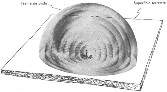 Cualquiera que sea el mecanismo de generación de la onda de radio, se puede aceptar que dicha onda existe, porque sus efectos pueden ser medidos, es posible recogerlos en una antena receptora a gran distancia. Consideremos ahora qué pasa con la onda cuando atraviesa el espacio desde el transmisor hasta el receptor. Cuando la energía proveniente de la antena fluye hacia el espacio, cubre un volumen cada vez mayor. Podemos visualizar una onda simple como la mitad de una pompa de jabón (lámina IV) de tamaño creciente. Cerca del transmisor, el área de la superficie de la pompa es pequeña y la energía dentro de cada metro cuadrado de su superficie es grande. A distancias mayores, la energía se extiende sobre un área mucho más grande y la contenida en cada metro cuadrado es correspondientemente más pequeña.